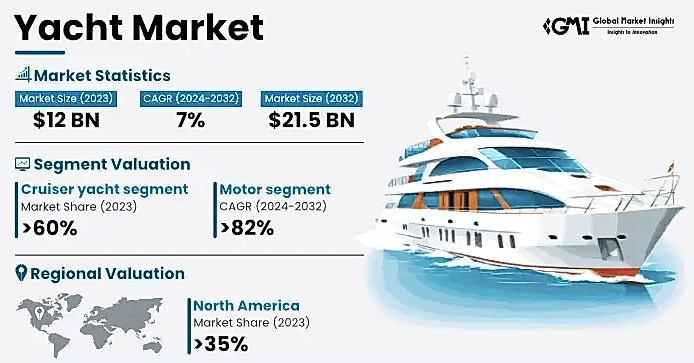 Yat pazarı büyüklüğünün 2023'te 12 milyar ABD doları olduğu tahmin ediliyor ve 2032'ye kadar %7'lik bir bileşik yıllık büyüme oranıyla büyümesi bekleniyor. Türkiye, yat üretim sektörünün önemli ölçüde katkıda bulunmasıyla bu küresel genişlemeden faydalanıyor.