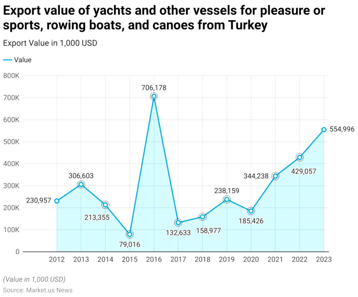 2012 ile 2023 yılları arasında Türkiye'nin eğlence veya spor amaçlı yat ihracatı dalgalanmalar gösterdi. 2016 yılında ihracatın 706.178 bin dolara ulaşmasıyla önemli bir zirve gözlemlendi, ancak sonraki yıllarda bir düşüş yaşansa da eğilim genel olarak olumlu oldu.